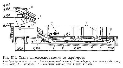 Шлак и зола сбрасываются в приемный канал, расположенный в золовом помещении, и далее с помощью скрепера, горизонтально-вертикального подъемника или другими механизмами подаются в сборный бункер, находящийся за пределами котлов. Транспорт шлака и золы на золоотвал или на завод для переработки осуществляется автомашинами или железнодорожными вагонами. На рис. 28.1 показана механическая система шлакозолоудаления со скрепером.
